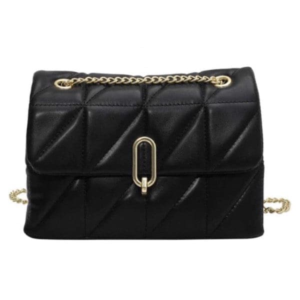 This quilted vegan leather bag is a conversation starter. It’s definitely a bag that you carry around and wear everywhere you want to stand out. This bag has a shoulder length chain strap that can be doubled up to carry shorter, and has dual inside compartment with inner zipper pocket. Gold turn lock closure completes the look.
